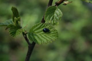 2017 05 09 Nevėžio pakrantėje ant Alksnio lapo vėl užfiksavau tuos vabalus, kurių paprastai pilna ten kur tik alksniai. Dėl jų kaltės vėliau vasarą tampa sunku rasti sveiką alksnio lapą. To kaltininkas – mėlynasis alksninis lapgraužis (Agelastica alni L.), esu jį užfiksavęs ir anksčiau, bet tik dabar pastebėjęs ant alksnio sumaniau jo paieškoti kaip alksnių kenkėjo.