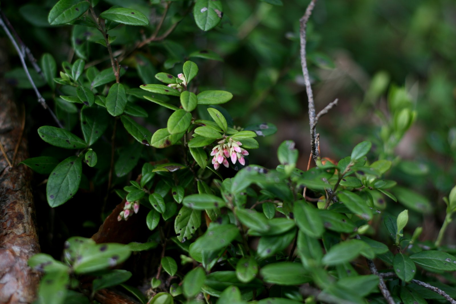 Artėjant prie pelkės, miško paklotas tampa drėgnesnis ir matyti žiedus brandinančios bruknės. Jų žiedai ne pavieniai, auga “kekėmis” po kelis, kaip ir uogos, kurias vėliau rudenį galėsime rinkti, jei žiedų neapgadins vėlyva šalna. Bet čia ne bruknynas, matyti tik pavieniai bruknenojai, tad kažin ar kas išsiruoš brukniauti būtent čia. Nenusimenu, žinau, kad jei ne žmogus, tai bent miško žvėrelis ar paukštis uogomis tikrai pasidžiaugs. Judu artyn link kažko kas baltuoja tolumoje.