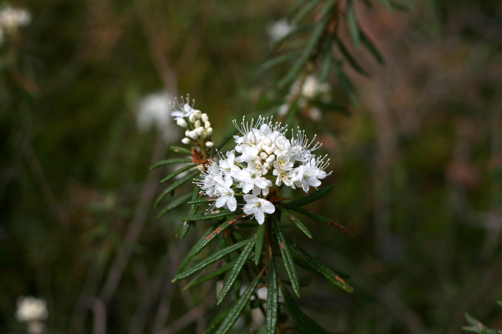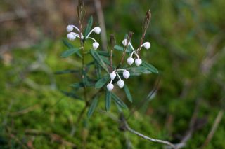 Pelkėje baltuoja ne vien gailiai. Ant ilgo plono koto iškeltos į mažas pūkuotas uodegėles panašios augalų viršūnės, tai, galbūt, kokia nors smilgų rūšis, tačiau jų nepažįstu. Kiek toliau pastebiu baltas žiedų kekes, iš tolo matydamas krūmelį pamanau, kad tai meškauogė, bet lapai paneigia mano spėjimą. Tenka tik nufotografuoti ir džiaugtis radus dar vieną nematytą augalą.