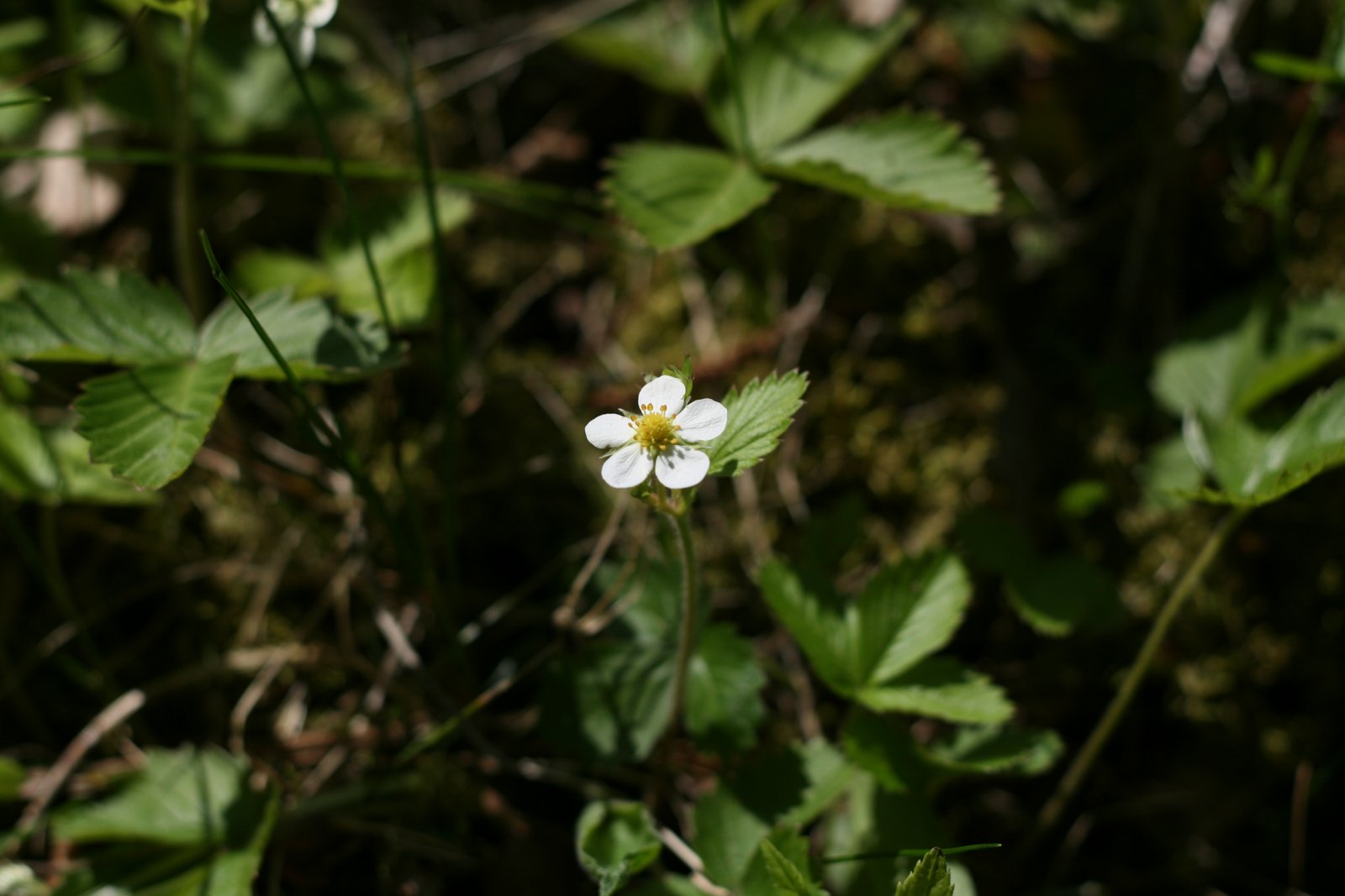 Dar nespėjus paeiti nuo kelio mane pasitinka pirmieji miško uogų žiedai - tai žemuogės. Čia žydi vienas kitas kerelis ir kelia aukštyn savo baltą geltonu viduriu žiedą. Kažkas labai apsidžiaugs radę prinokusią uoga.