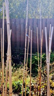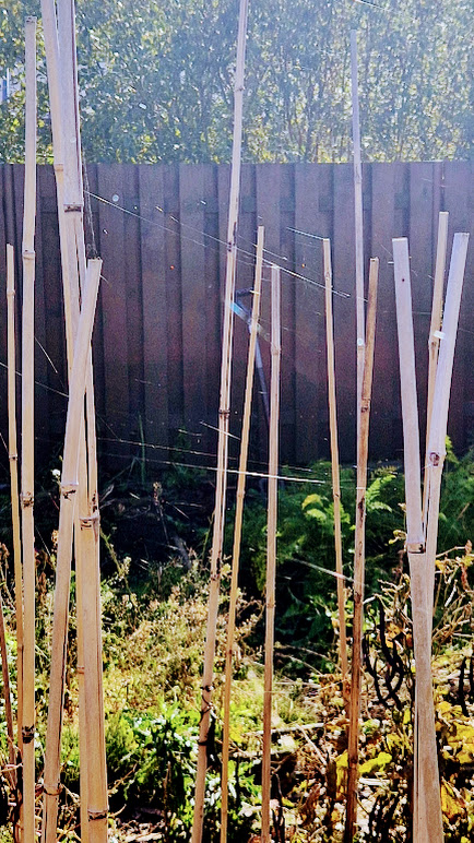 Atidarau duris ir einu iš arčiau apžiūrėti tų blizgančių gijų. Nemažai jų prisipynę ant lazdų, kuriomis vasarą aukštyn lipo pupelės. Dabar tai jau nebe šiaip lazdos - tai kotai voratinklių vėliavoms.