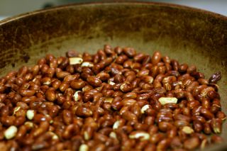 - Žemės riešutus taip pat paskrudinkite sausoje keptuvėje. Nuolat maišykite, riešutai aliejingi tad nenustebkite, kai įkaitę jie taps blizgūs. Kai nuspręsite, kad paskrudo pakankamai - išpilkite į indą kuriame galės atvėsti.