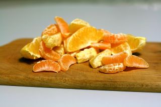 - Vieną apelsiną nulupkite ir atskyrę skilteles jas stambiai supjaustykite. Tą patį padarykite ir su mandarinais.