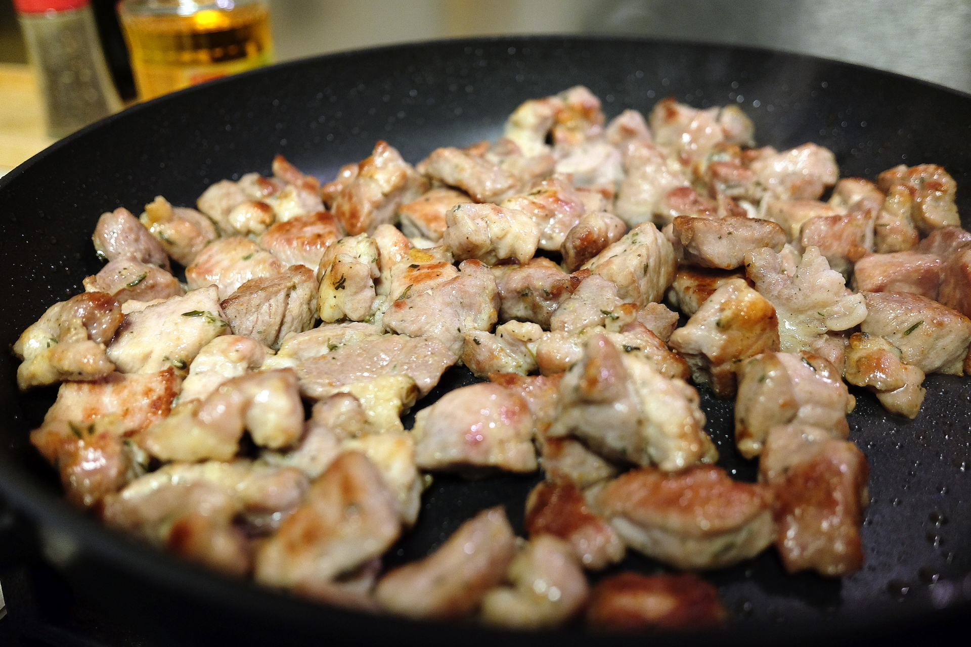 Dedame kaisti keptuvę ir tuo tarpu pjaustome kiaulienos sprandinę 1,5 x 1,5 cm gabalėliais. Kai jau keptuvė karšta, į ją pilame porą šaukštų aliejaus ir gerai kepiname mėsą apie 10 min. Labai dažnai nemaišykite, leiskite mėsai lengvai apskrusti.