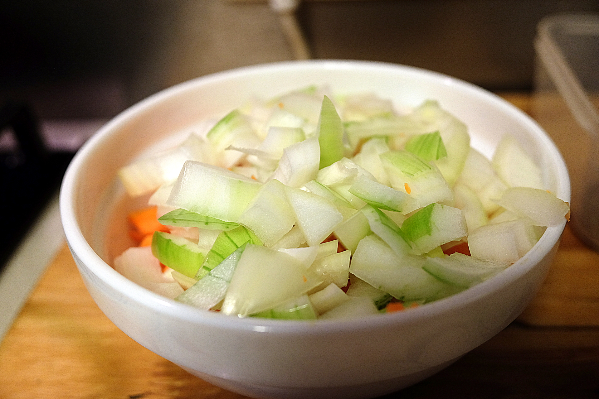 Tarpuose, kai nemaišome kepančios mėsos, nuskutame morkas ir nulupame svogūnus. Morkas sutarkuojame rupiai, o svogūnus supjaustome gana stambiais gabalėliais. Česnakus paruoškite kaip jums labiau patinka. Galite pjaustyti smulkiai ar stambiai, ar net visai nepjaustę ir net nelupę juos ištrėkšti.