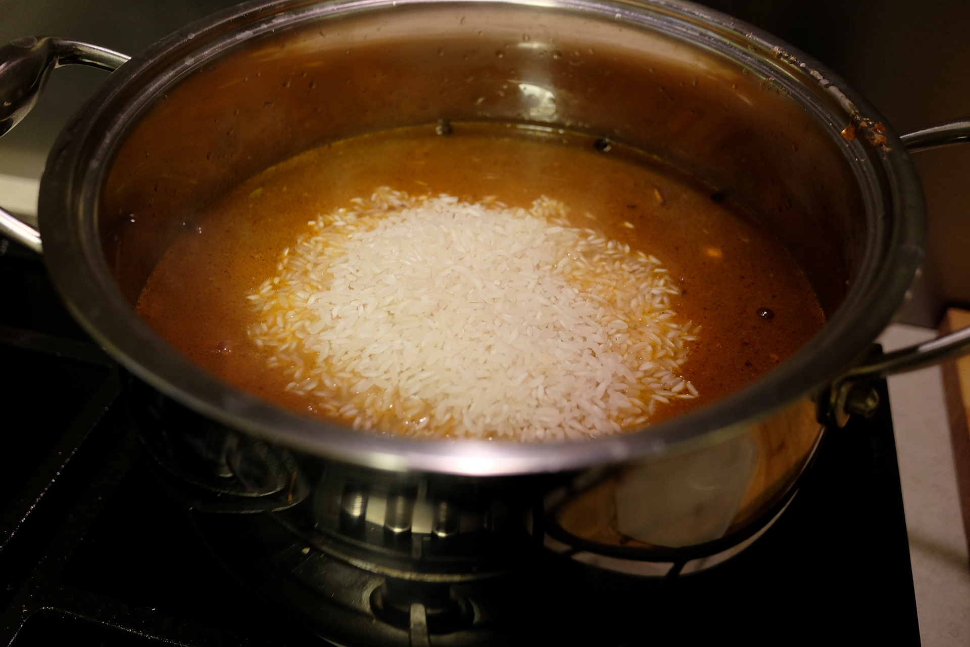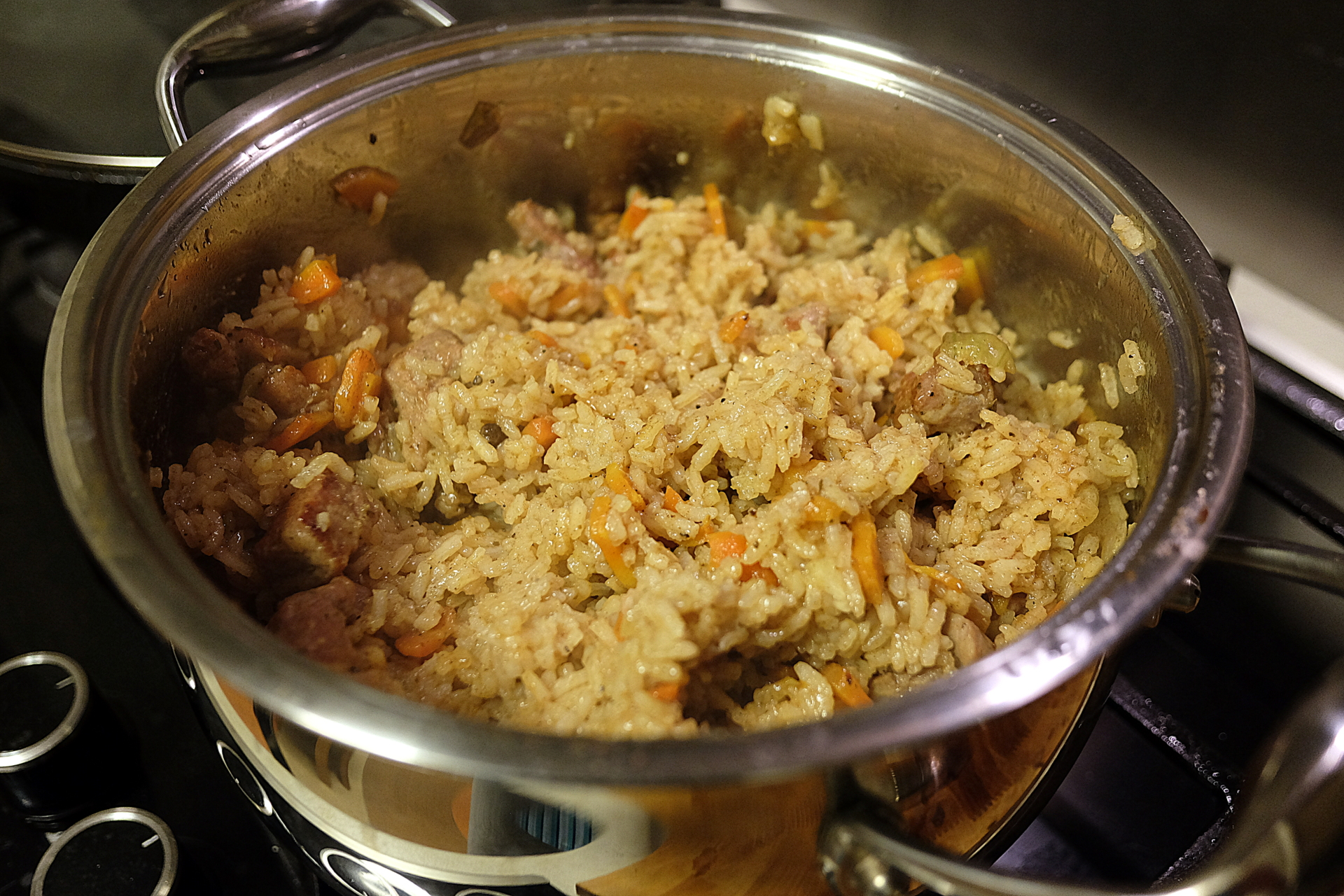 Po 20 minučių ryžiai dar nebus visiškai išvirę, tačiau viryklę išjunkime. Greitai pravėrus dangti ir neleidžiant, kad puodas atauštų, pamaišykime. Jei matyti, kad išgaravo daug vandens - įpilame šiek tiek iš virdulio. Greitai uždenkime puodo dangti.