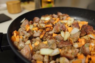 Po 10 min, jei mėsa gražiai paskrudo, pilame visas smulkintas daržoves, 2 šaukštelius druskos, visus prieskonius, ir dar pakepame apie 10 min, kol svogūnai ir morkos iškepa. Dabar jau reikia maišyti dažniau. Jei matote, kad keptuvė labai sausa, nepabijokite įpilti šiek tiek aliejaus.