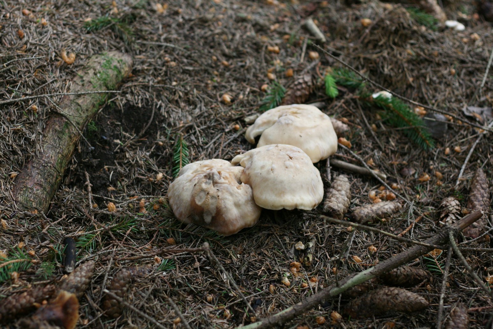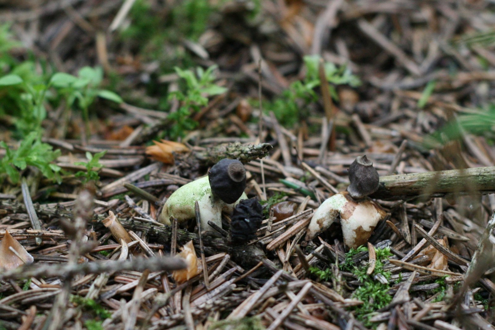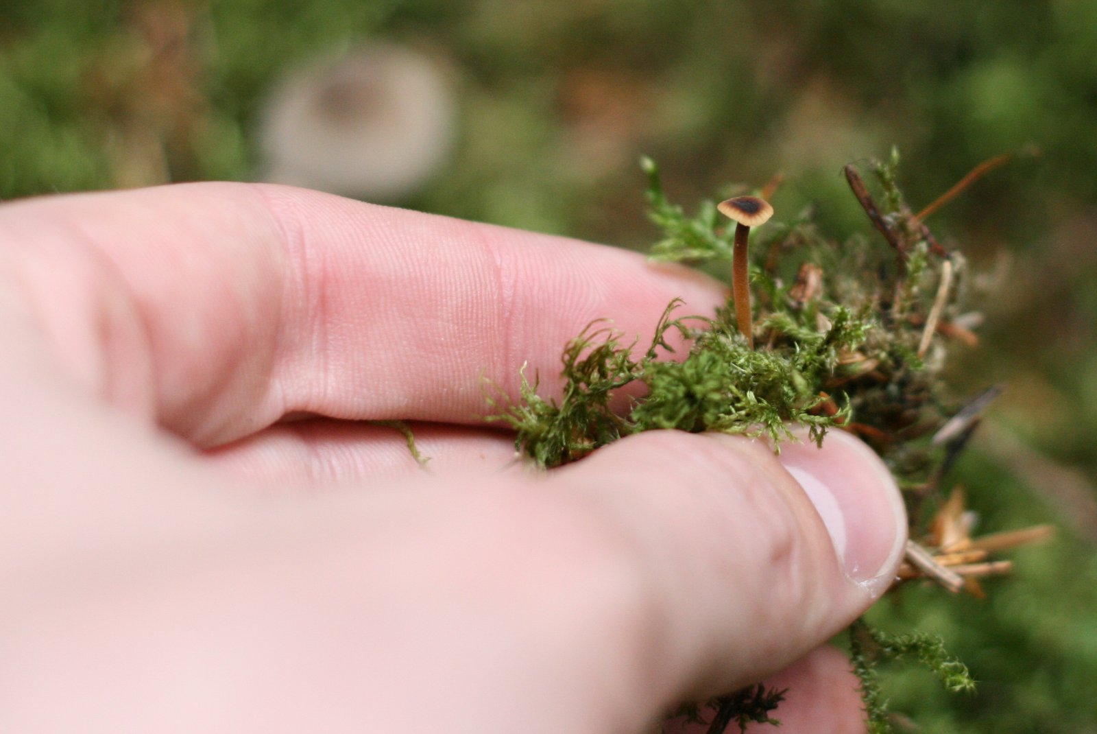 Džiaugiuosi pamatęs įdomių augalų, bet šį kartą žvalgausi grybų, nors tikimybė maža, vis kirba mintis, kad galbūt kur nors iš po spyglių sluoksnio galvą iškiš koks baravykas. Kol kas nesiseka, nusprendžiu, kad reikia žiūrėti atidžiau ir lenkiuosi arčiau žemės. Ir štai matau mažytį grybą, kurį stovėdamas kažin ar pastebėtum. Grybų pasaulis man kol kas labai nepažįstamas, tad net nebandau spėti kaip šis grybas vadinasi moksliškai. Fotografuoju ir tęsiu baravykų paieškas.