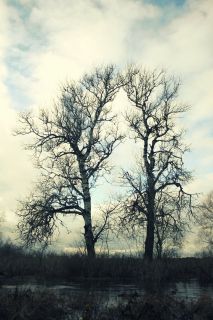 Braunuosi paupio šabakštynu kiek leidžia mano batai, nes upė smarkiai išsiliejusi iš vagos. Ir čia sustoju stebėdamas du medžius, kurie atrodo kažkuo įspūdingi. Fotografuoju. Pamažu darosi šaltoka, o vandenyje apsemti batai dar labiau vėsina. Tad nutariame jau sukti atgalios.