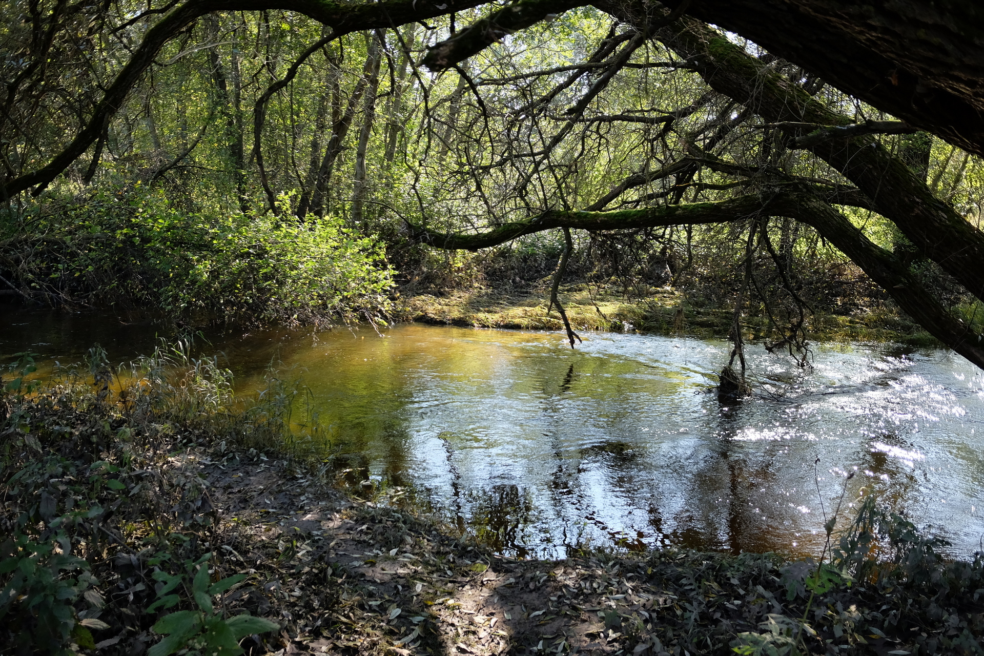 Prasibrovęs pro aukštą žolę patenku į palinkusio medžio sukurtą “kambarį” prie vandens. Apima iš ties malonus ramybės jausmas. Kažkur toliau čiulba paukščiai, čiurlena upelis, blizga upelio vanduo, į kurį atsimuša vidudienio saulės spinduliai ir neįprastai apšviečia palinkusį medžio kamieną iš apačios. Puiki vieta pabūti ramybėje su gamta.
