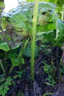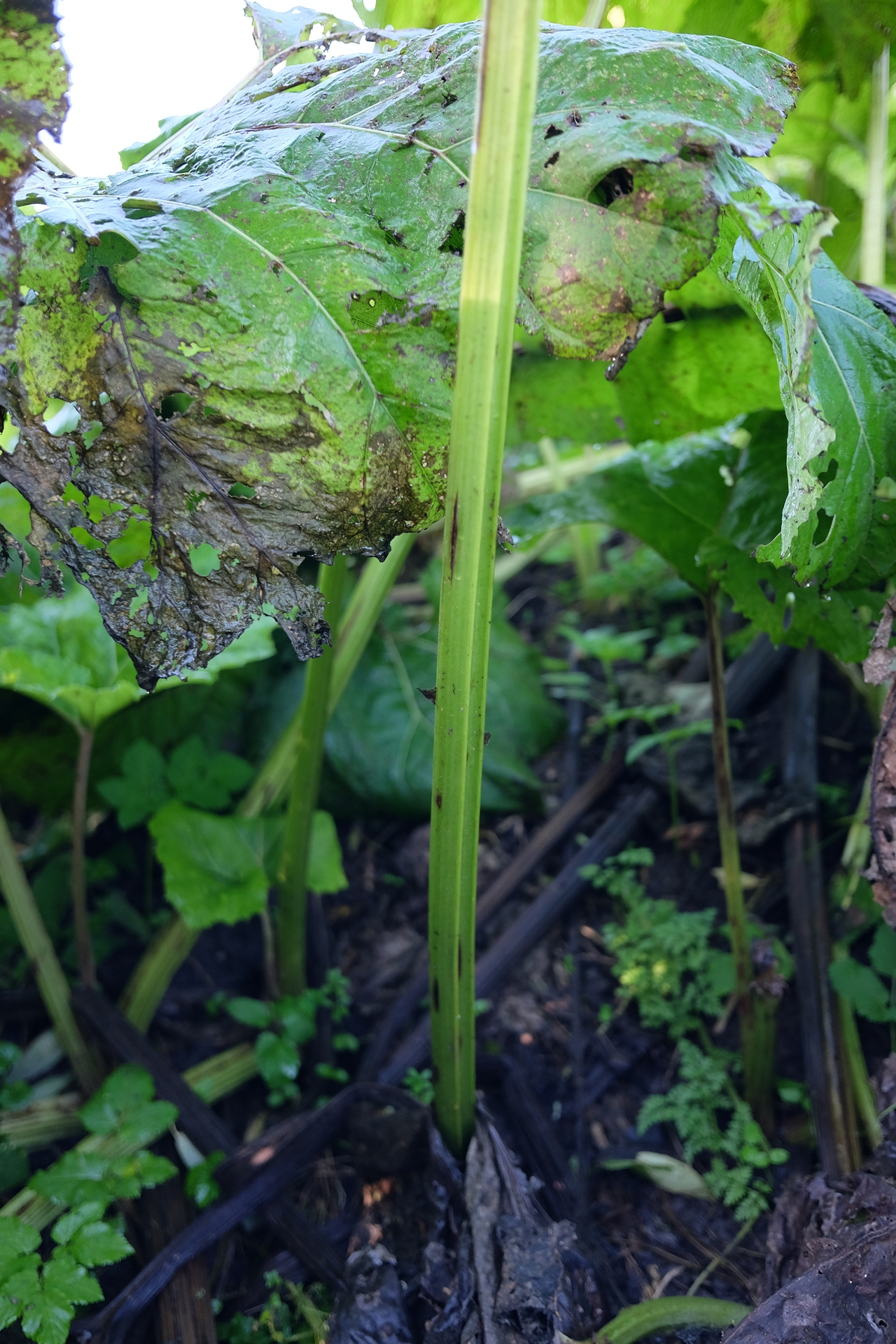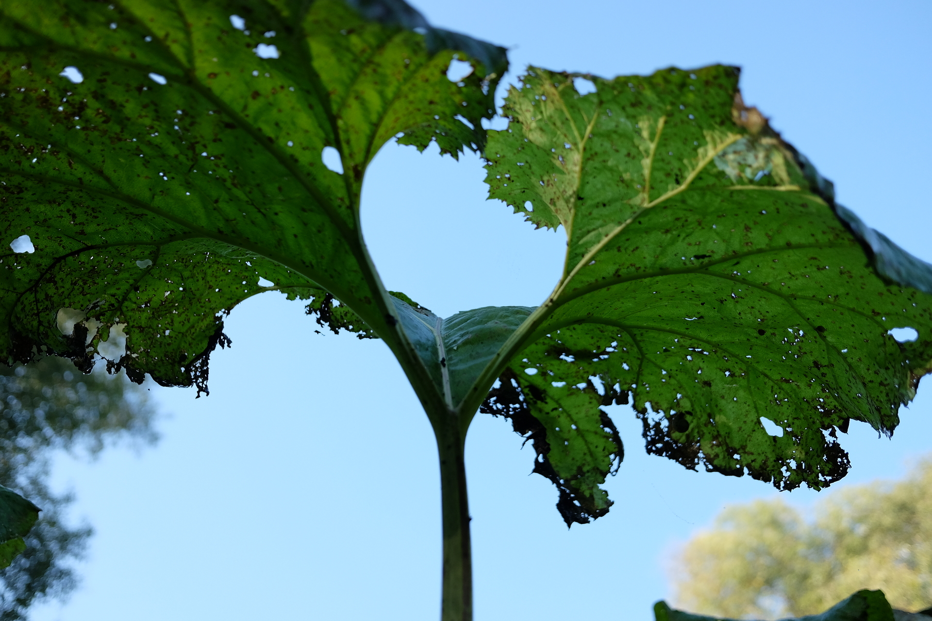 Prieinu arčiau Nevėžio vagos. Pakrančių žolynai parudavę, ne dėl šalnos, bet apnešti išsiliejusio vandens sunešto dumblo. Tvyro stiprus kvapas , tačiau jis ne bjaurus. Paėjus toliau matyti didžiulis plačialapių šaukščių laukas. Jų didžiuliai lapai man siekia smakrą ir tiesiogine žodžio prasme galima slėptis po jais, tik ne po pernykščiais, nes jie iki žiemos visiškai sunyksta. Kol kas dar tvirtą, platų lapą laiko stambus, rabarbarą primenantis, lapkotis. Plačialapis šaukštis nėra labai dažnas augalas Lietuvoje, mėgsta drėgnas, šaltiniuotas augimvietes, o čia prie almančio upeliuko jam puiki augimvietė.