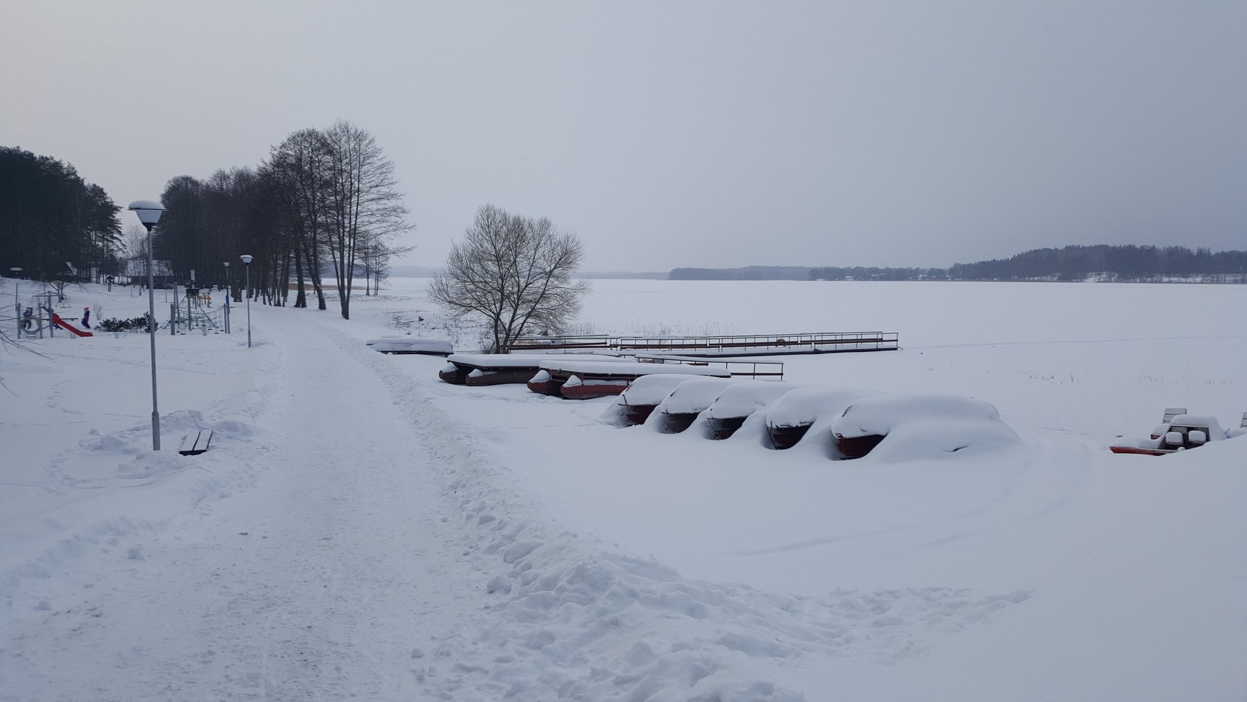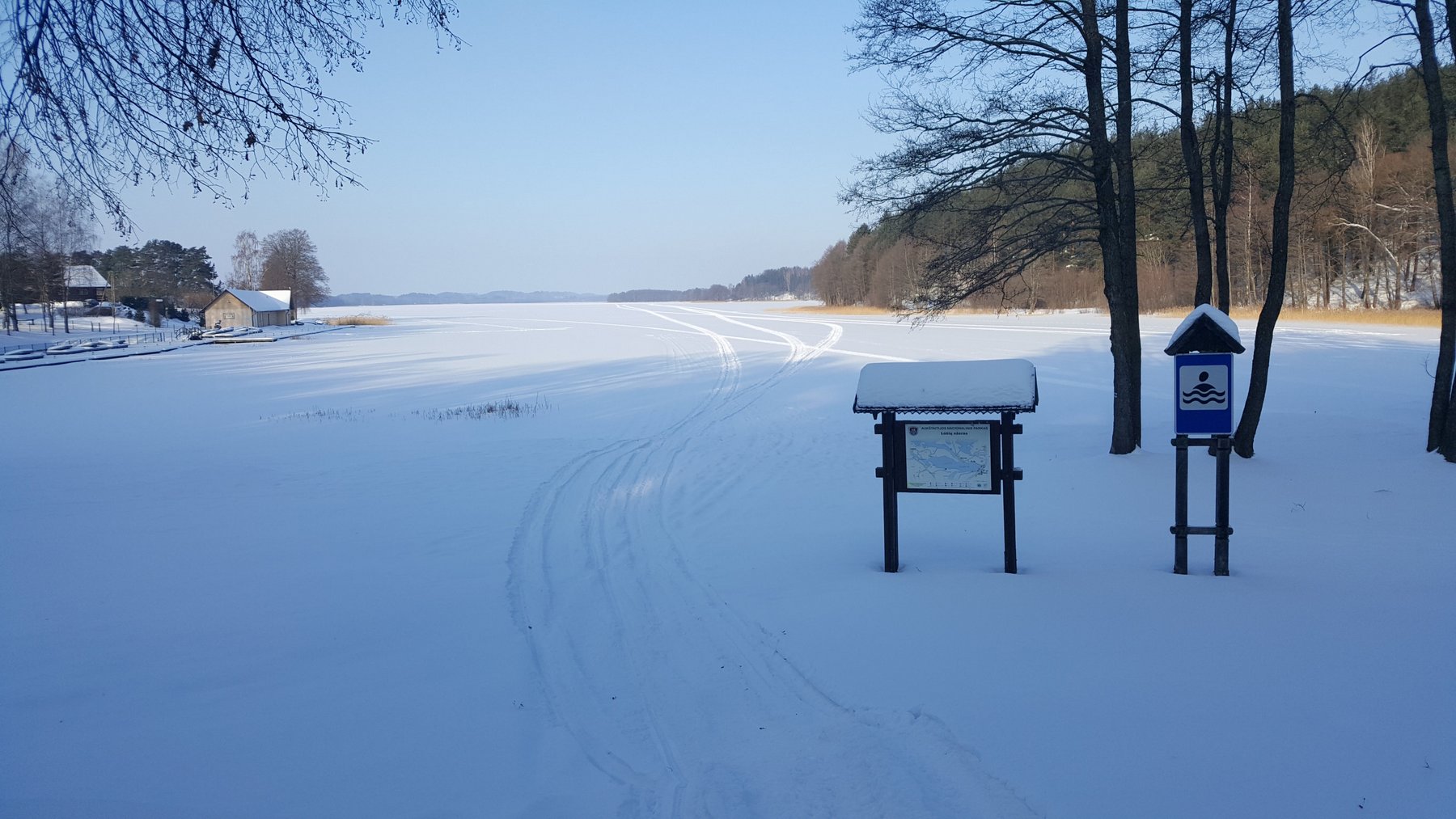 Pamažu žingsniuojame palei ežerą, čia kaip tik vyksta stintelių gaudymo šventė. Nedidelė mugė, kepamos atvežtinės stintos, vietoje rūkoma žuvis, galima įsigyti kepinių ir kitų mugėms būdingų smulkmenų. Nusprendžiame neužsibūti, užsuksime įveikę numatytą maršrutą. Tad jau kažkada vasarą eitu keliu žingsniuojame labai nenutoldami nuo ežero, praeiname stvyklavietę, kurioje kelis kartus stovyklavome vasarą. Puiki proga sustoti ir atsipūsti. Sustojus nusileidžiu link ežero, kad galėčiau užlipti ant ledo ir pasigrožėti žiemišku ežero vaizdu. Tolumoje matyti keletas žvejų.